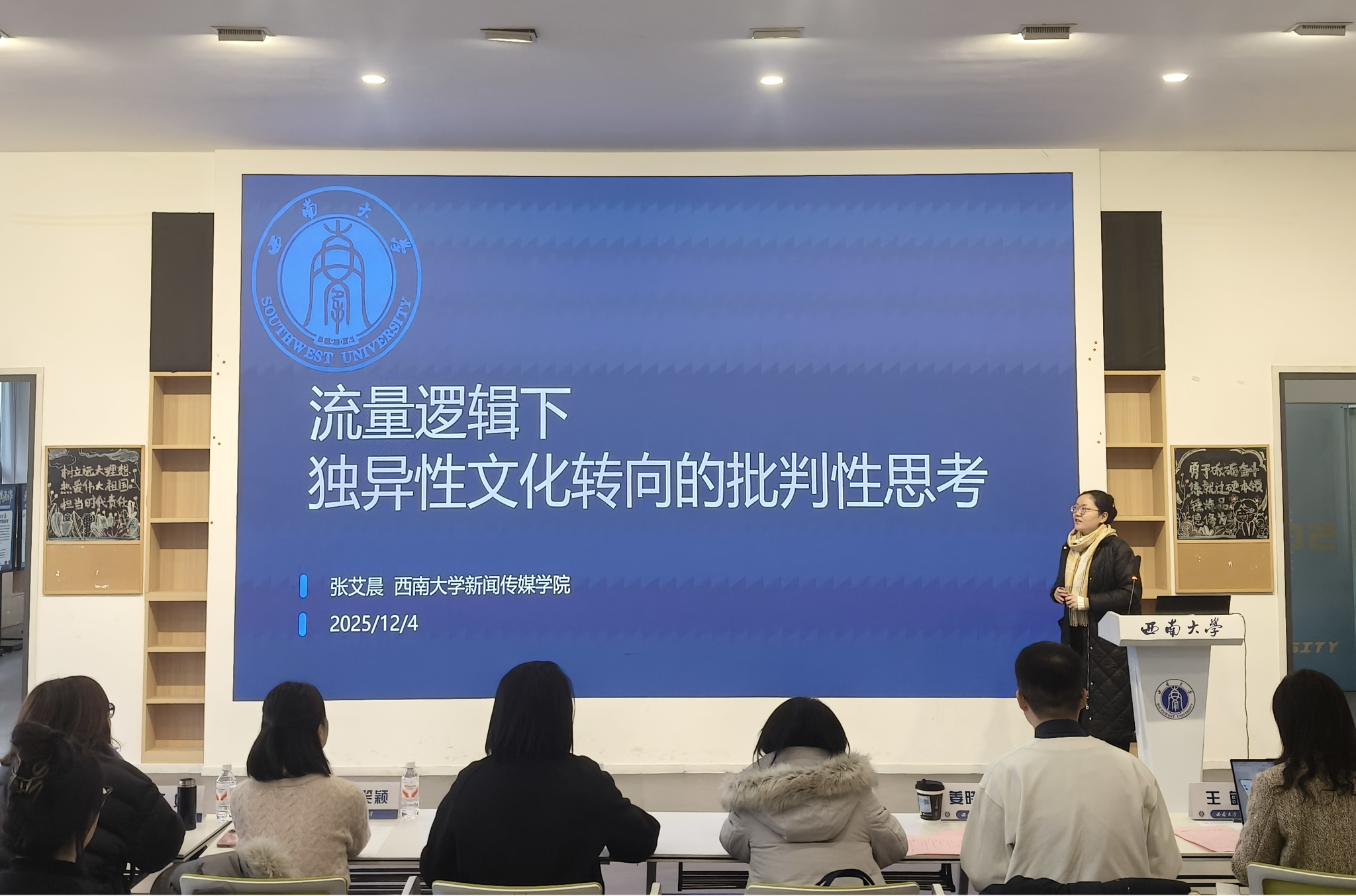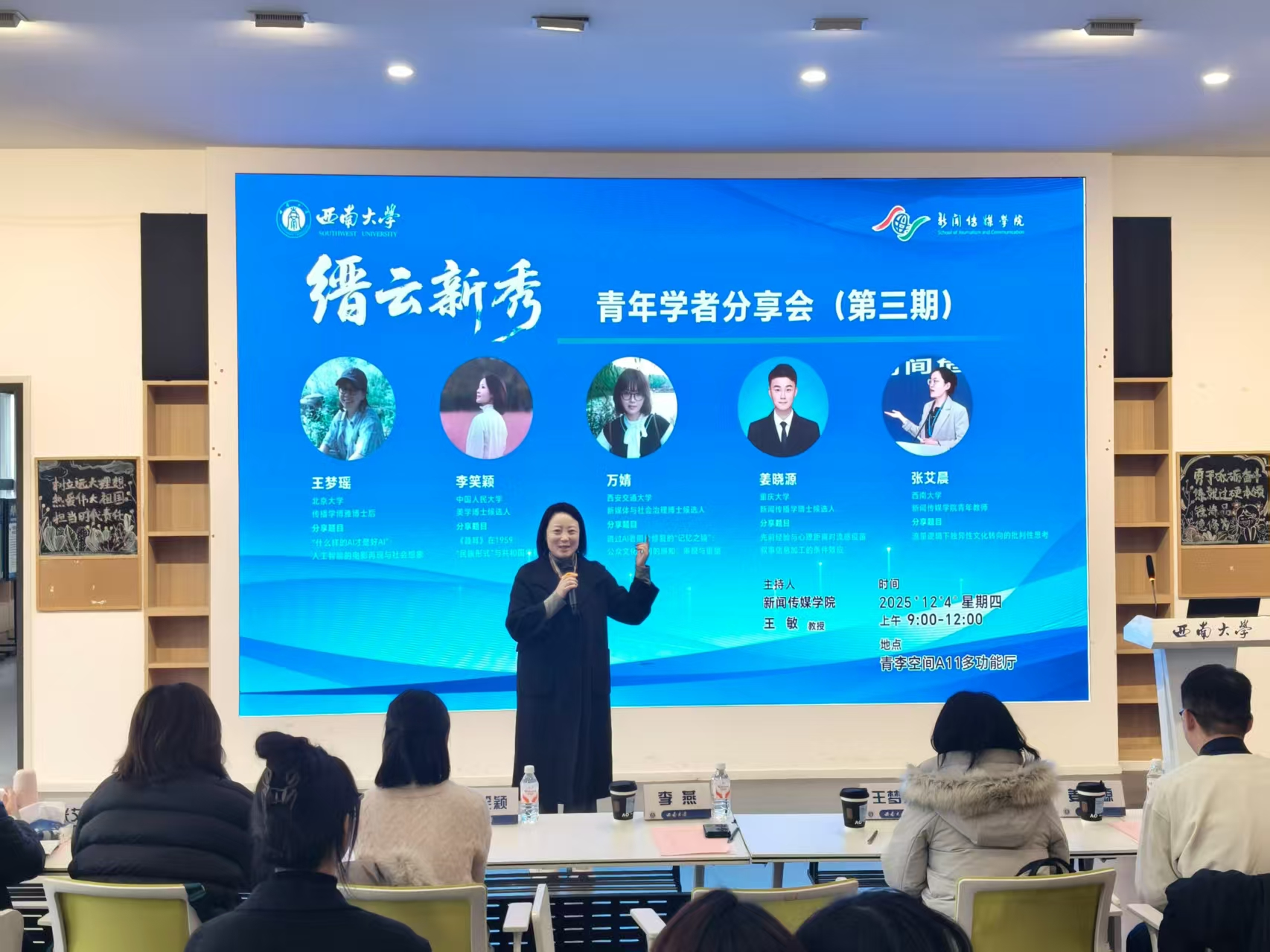 2025年12月4日上午,新闻传媒学院“缙云新秀”青年学者分享会第三期在青李空间A11成功举行。本期分享会邀请北京大学传播学博雅博士后王梦瑶、中国人民大学美学博士候选人李笑颖、西安交通大学新媒体与社会治理博士候选人万婧、重庆大学新闻传播学博士候选人姜晓源、西南大学新闻传媒学院青年教师张艾晨担任主讲嘉宾。会议由新闻传媒学院王敏教授主持,新闻传媒学院党委书记李燕及部分学生到场参与。
