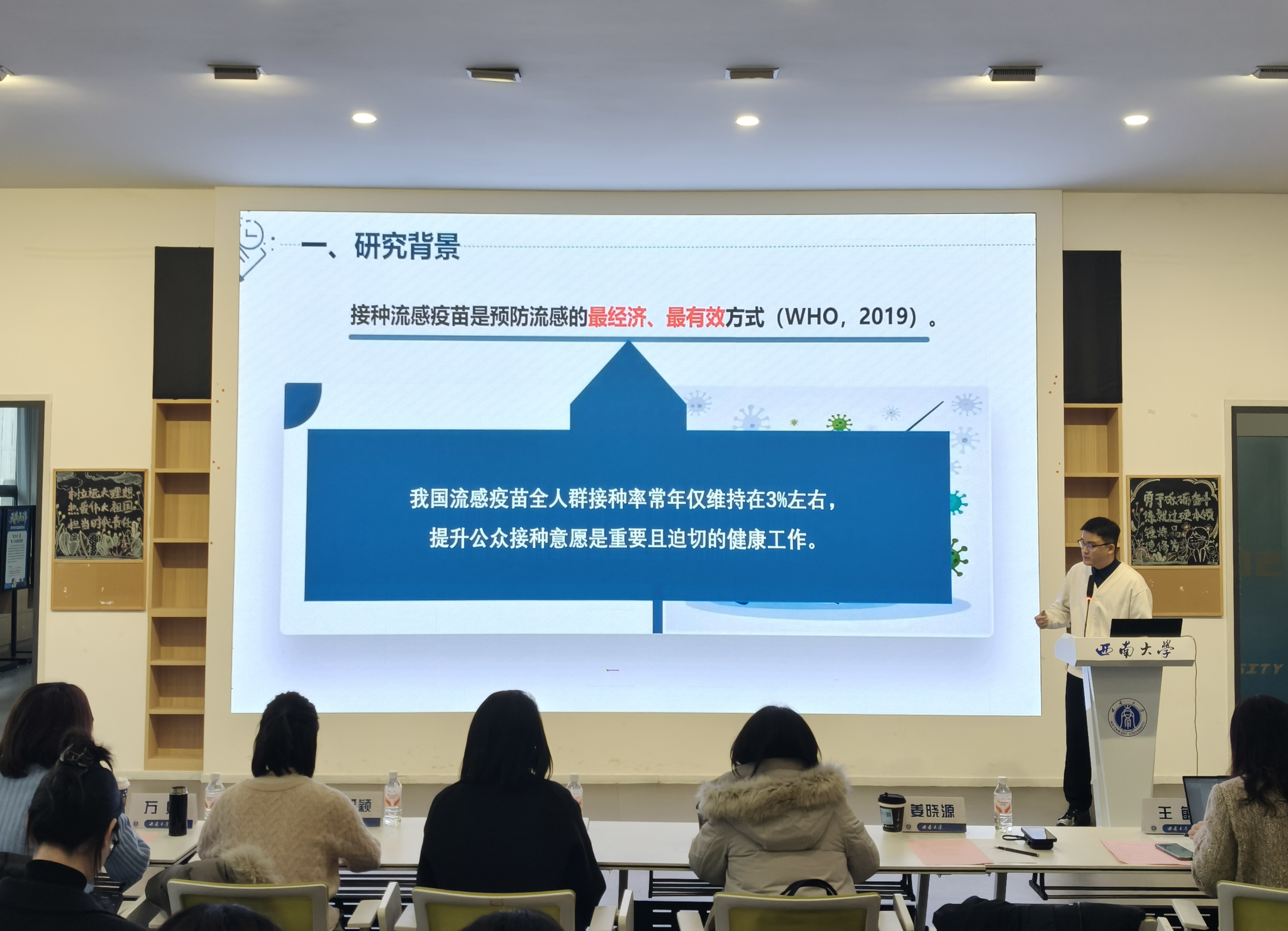 重庆大学新闻传播学博士候选人姜晓源则从健康传播出发,分享了《先前经验与心理距离:对流感疫苗叙事信息加工的条件效应》。他的研究通过实验发现,叙事信息并非对所有人群都更有效,其说服效果受到受众先前接种经验和心理距离的显著调节。这一发现为针对不同认知图式的公众实施精准化、分众化的疫苗健康传播策略提供了实证依据。