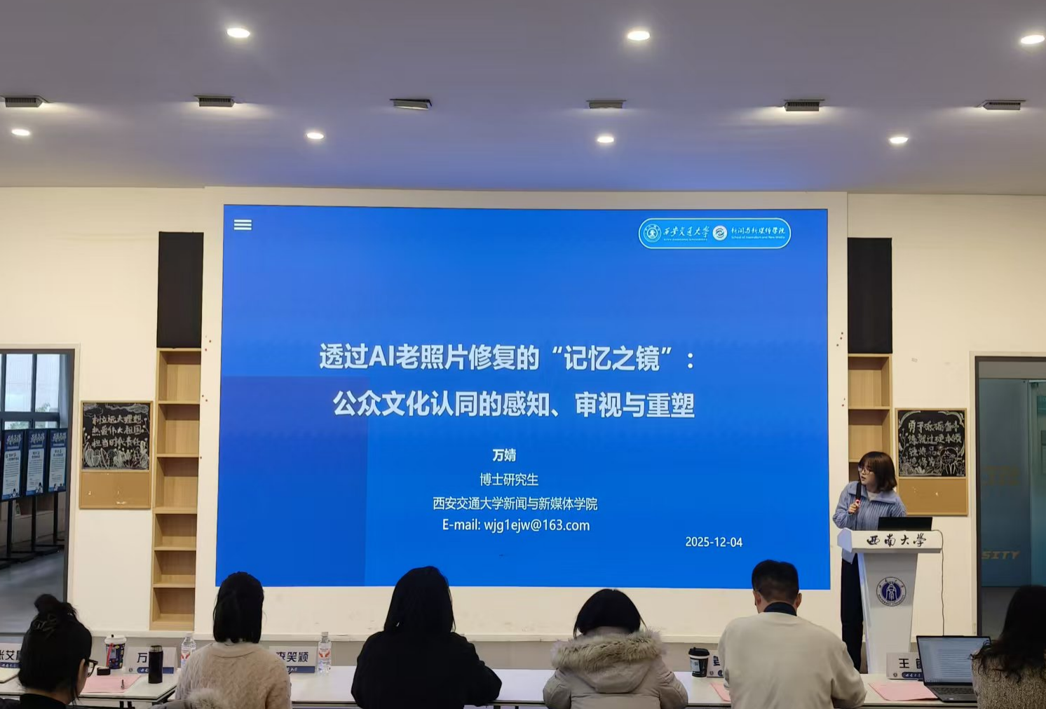 聚焦技术修复与历史感知,西安交通大学新媒体与社会治理博士候选人万婧报告了《透过AI老照片修复的“记忆之镜”:公众文化认同的感知、审视与重塑》。通过系列在线实验,她的研究发现AI修复会降低公众对历史照片的感知真实性与文化认同感,而模糊披露AI介入的方式负面影响最大。研究同时证明,提供权威背书、补充历史背景等干预措施能有效重建公众的技术信任与文化连接。