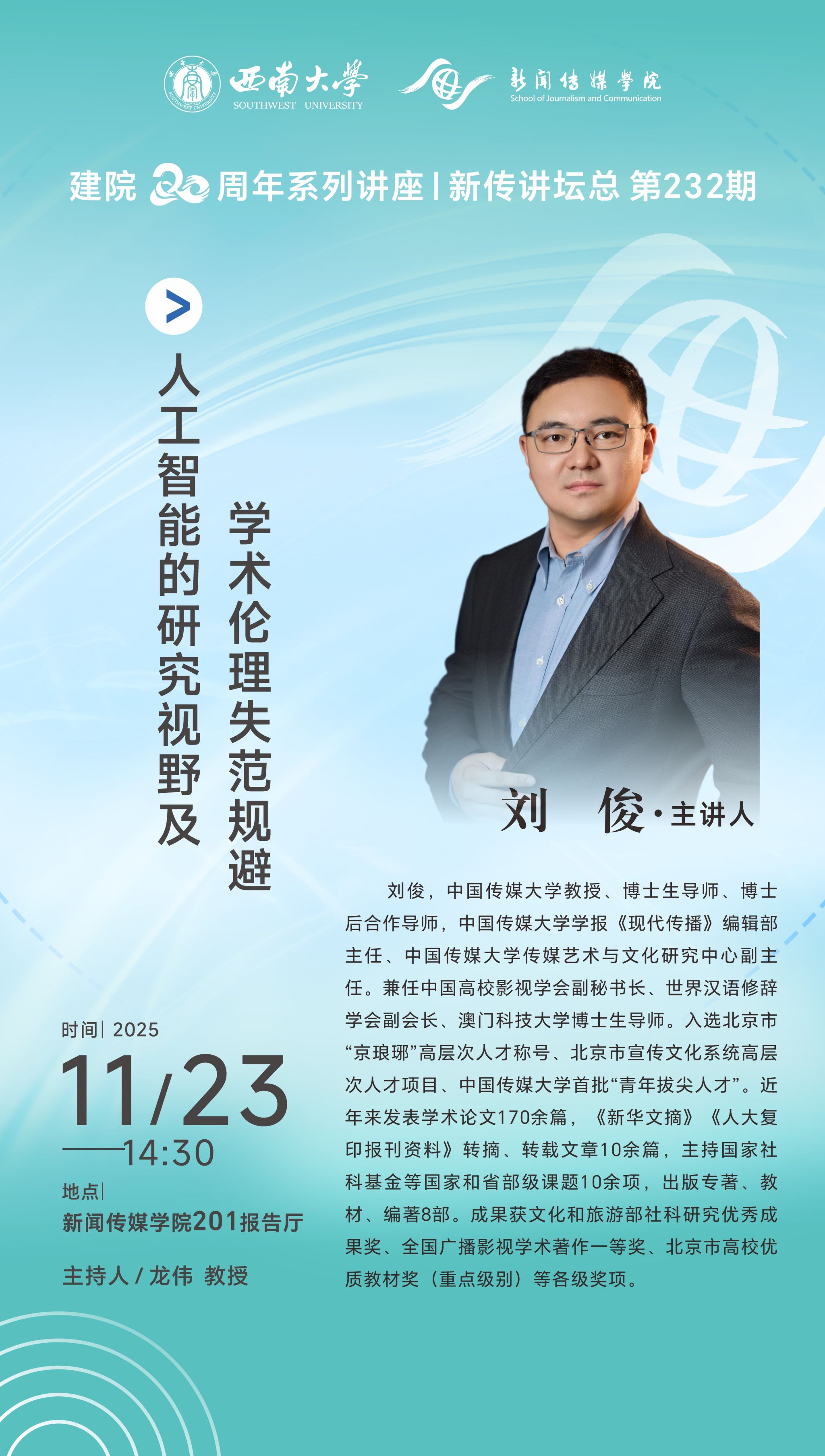建院20周年系列讲座 | 新传讲坛总第232期|刘俊:人工智能的研究视野及学术伦理失范规避