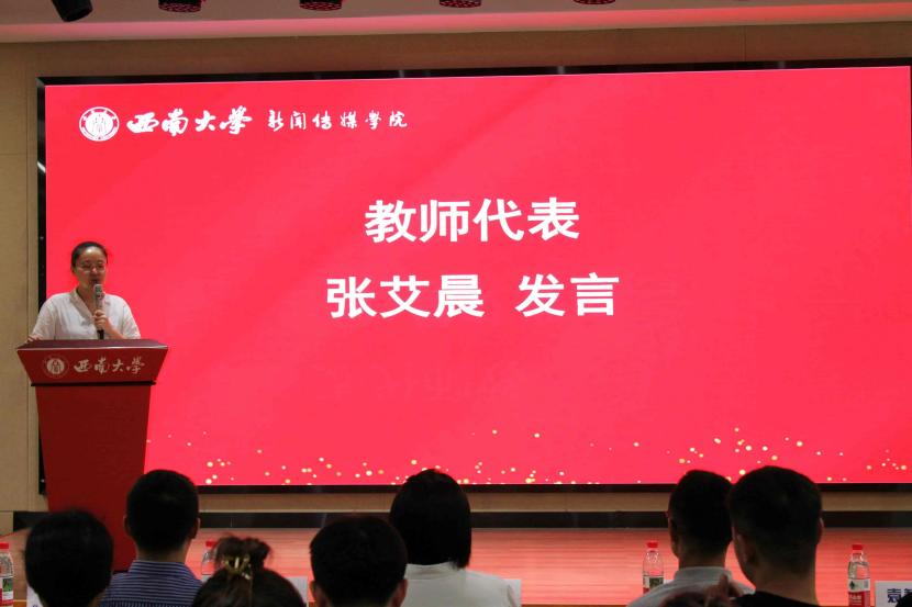 教师代表张艾晨则从专业视角出发 介绍了新闻传媒学科的发展前景与学习要点,寄语新生们保持对传媒行业的热爱,在实践中提升专业能力。