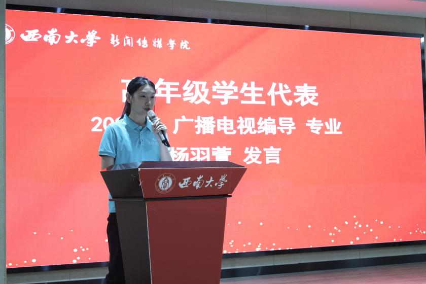 2023级广播电视编导专业杨羽萱作为高年级学生代表,结合自身学习生活经历,从专业学习方法、校园活动参与、个人成长规划等方面分享经验,鼓励新生们珍惜大学时光,勇敢探索未知。