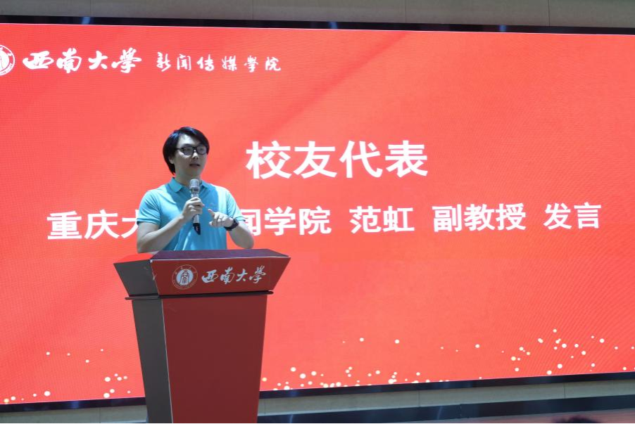 校友代表、重庆大学新闻传媒学院范虹副教授结合自身职业发展历程,分享了传媒人应具备的责任与担当,为新生们的未来发展提供了宝贵指引。