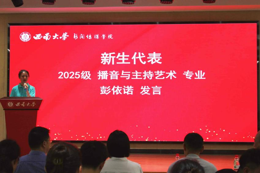 新生代表2025级播音与主持艺术专业彭依诺,以朝气蓬勃的姿态表达了对大学生活的憧憬,承诺将以勤勉踏实的态度追逐传媒梦想,不负青春与期待。