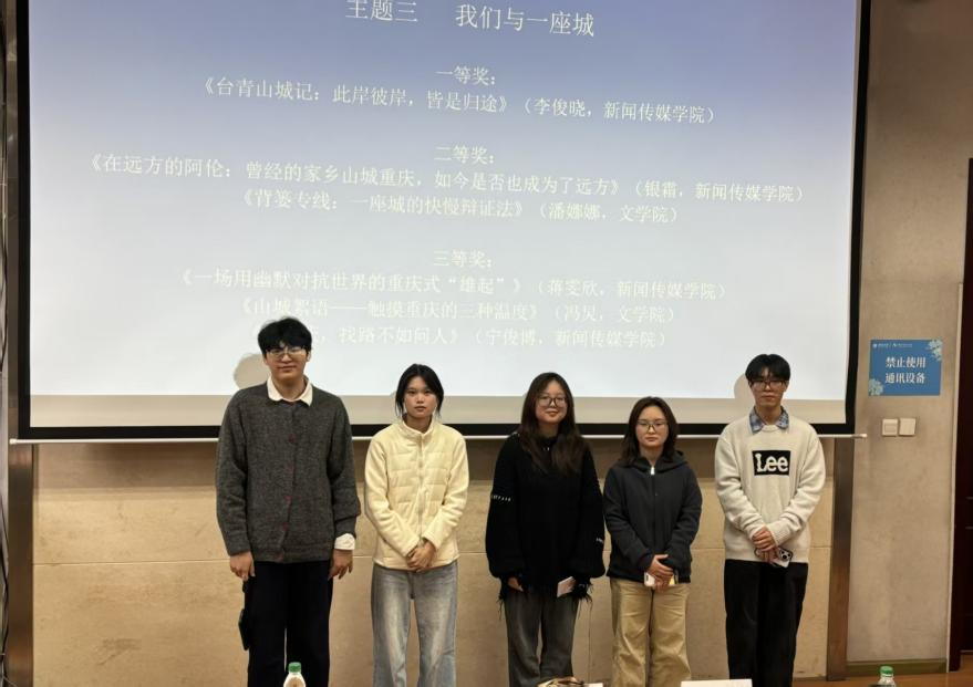 随后举行的颁奖环节中,杨绍婷老师公布了本届文化节优秀作品评选结果。活动共设立新闻采写、影像记录、深度调查、创意策划四大主题,累计征集作品百余份,最终评选出三十余件获奖作品。获奖学生代表现场分享了创作体会:文学院潘娜娜同学通过《背篓专线:一座城的快慢辩证法》,捕捉重庆轨道交通中菜农背篓与现代化设施之间的温暖反差;地理科学学院徐文慧与团队作品《透过地理之窗看雅鲁藏布江水电工程》,从人地协调视角解读国家工程的生态与人文意涵;我院唐灿同学则以历史回望的形式,致敬《新莱茵报》所代表的新闻求真精神。这些作品体现了同学们敏锐的观察力、深刻的社会思考与扎实的专业素养。